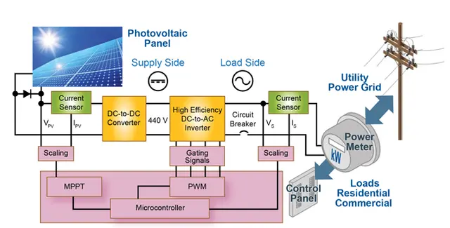 This picture shows a typical block diagram of a solar microinverter. The microinverter converts power from a single PV module and is usually designed for a maximum output power of 250W to 400W.